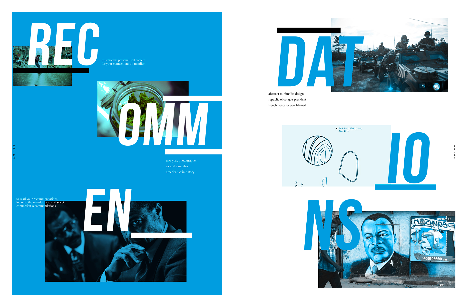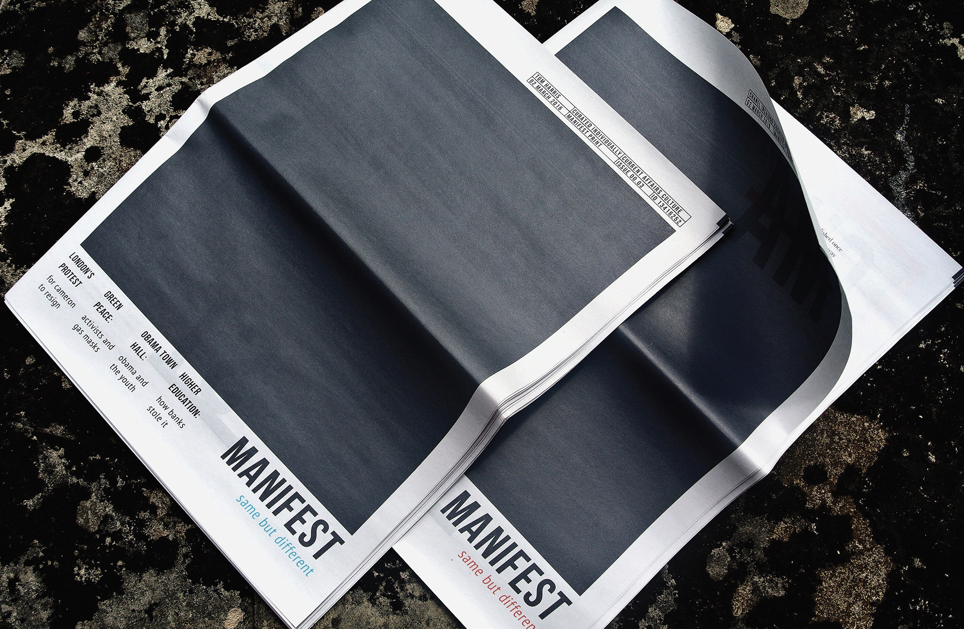 Manifest is a monthly digital tabloid designed to engage younger audiences with public affairs while challenging the notion that “print is dead.” The newspaper is personalized via an app, with user-specific content and a layered color overlay. The project brings back the tradition of collecting newspapers in a format that bridges digital and physical media, combining thoughtful design, interactivity, and printed production to create a unique, engaging experience.