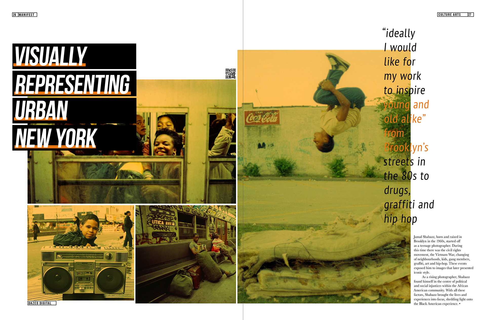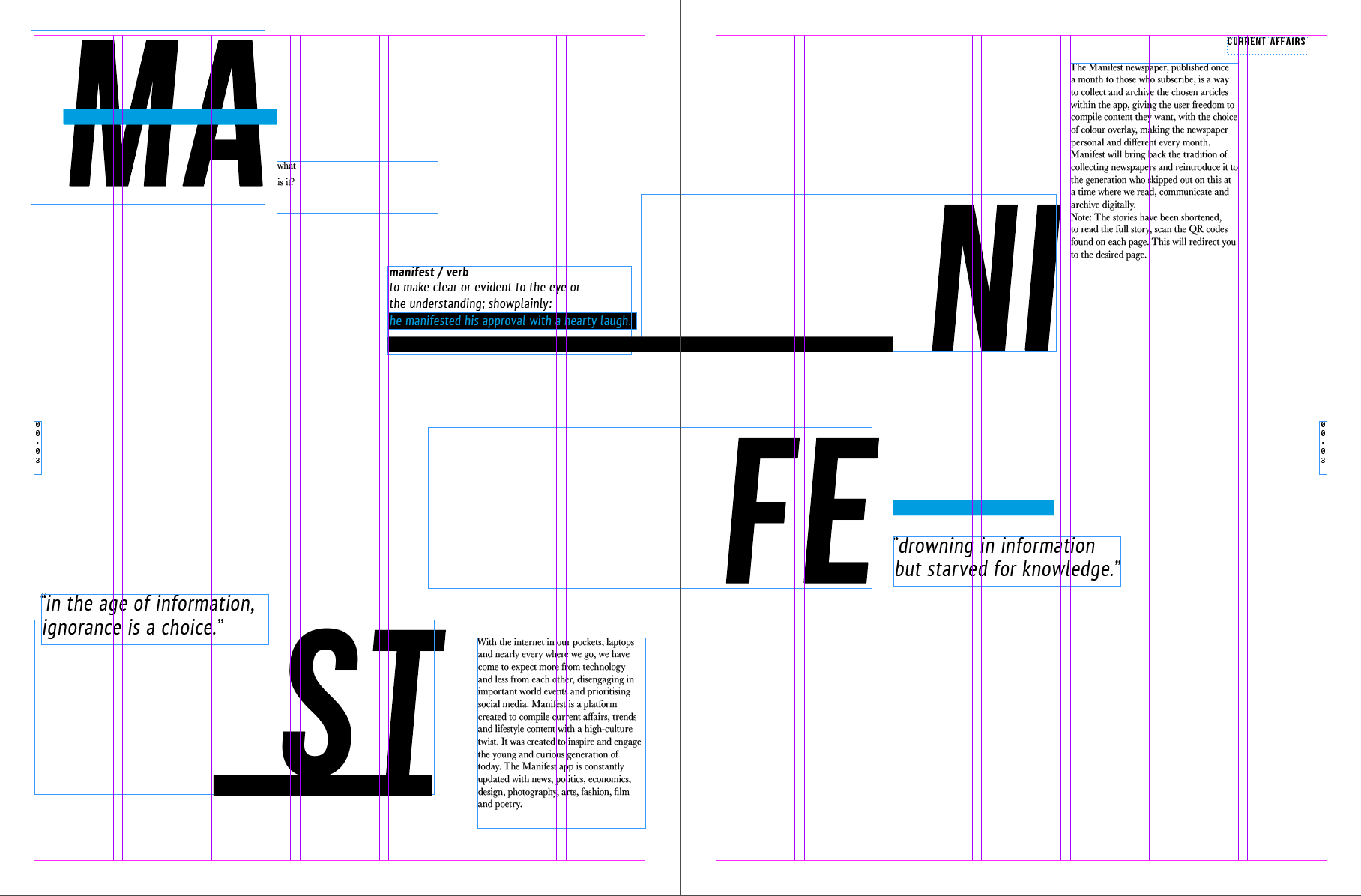 This highlights the design process behind Manifest, including grid layouts, flat-lays, and page composition in InDesign, showing how the concept translates into print. It also features the arts and culture section and character profiles representing different languages and interests, demonstrating how the newspaper can be personalised for diverse readers.